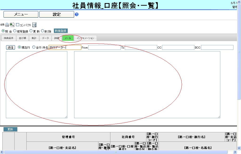 メールのタブをクリックすると、以下のような画面になり、メールの作成が可能です