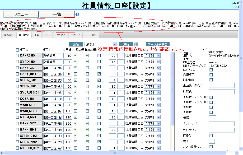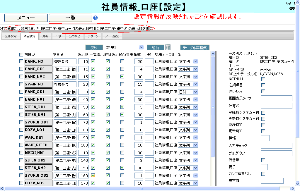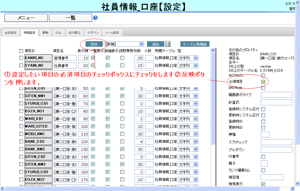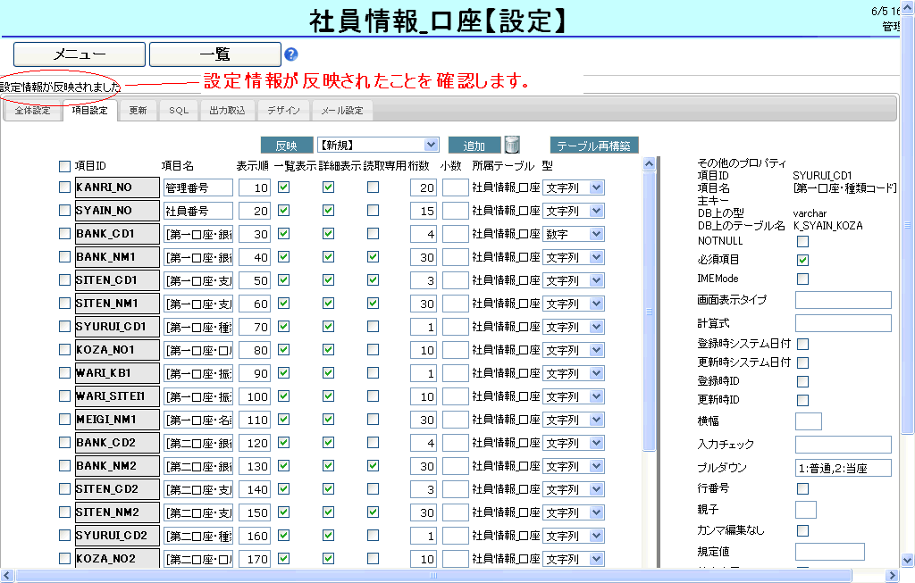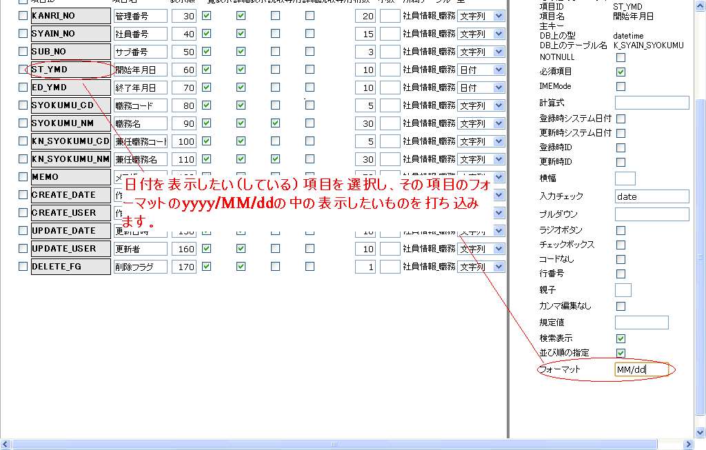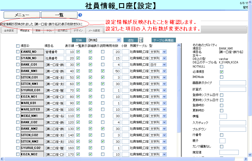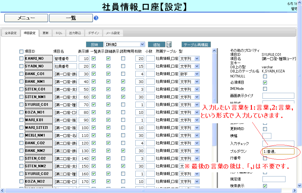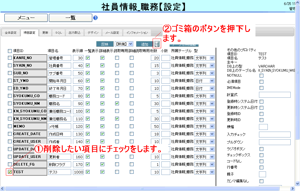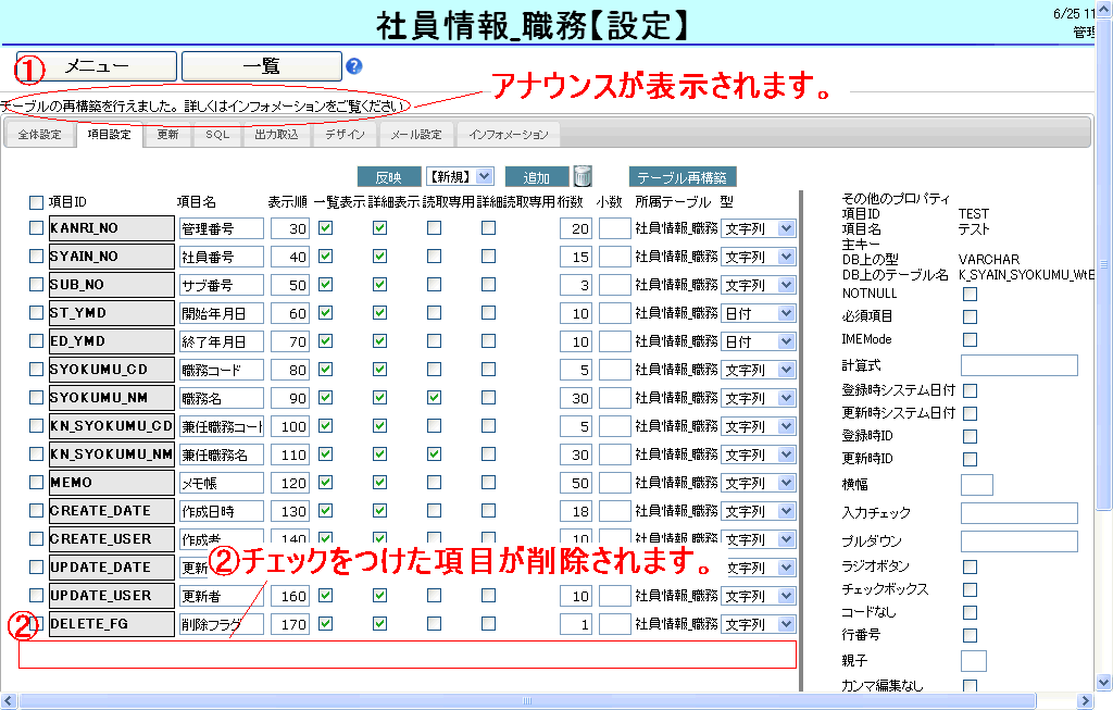 | ⑪更新時ID | チェックをつけると、その項目を更新した人のIDが表示されます |