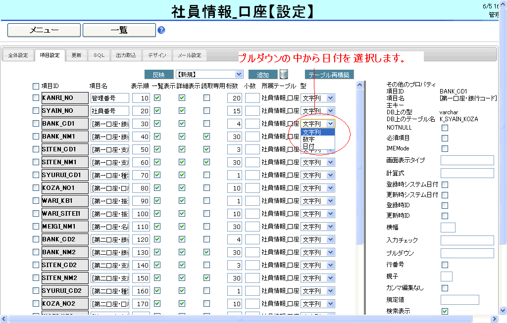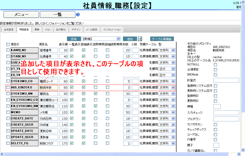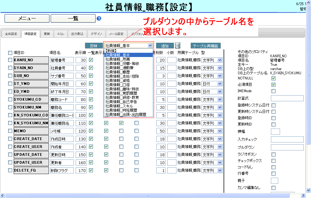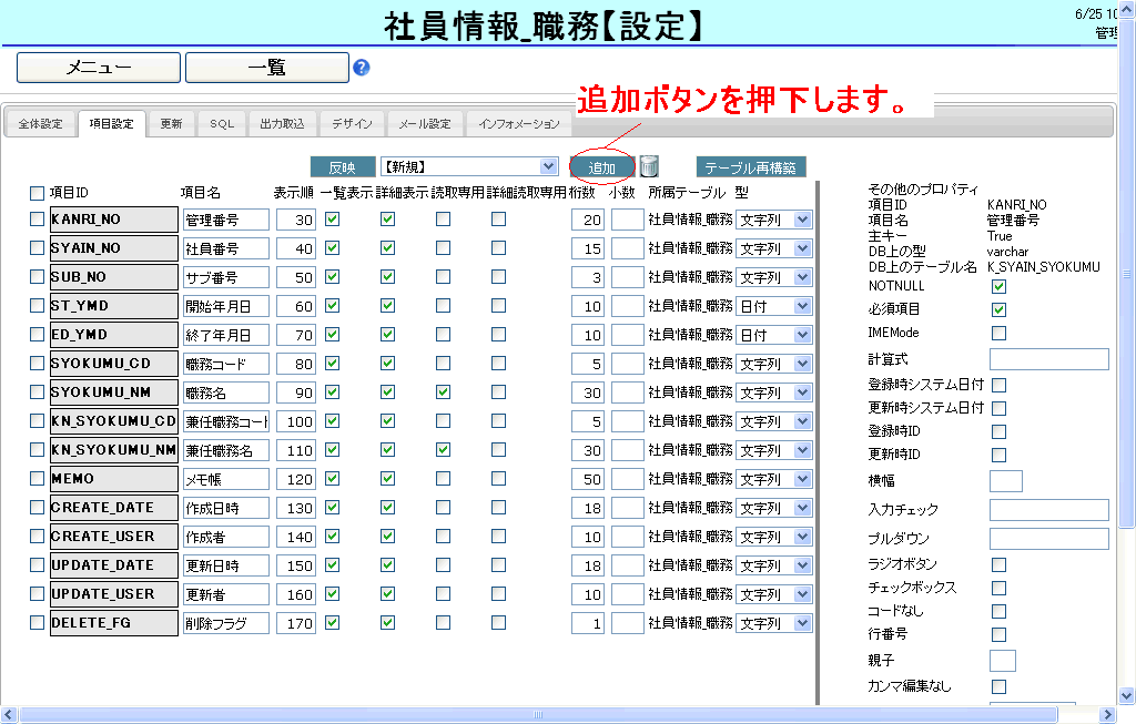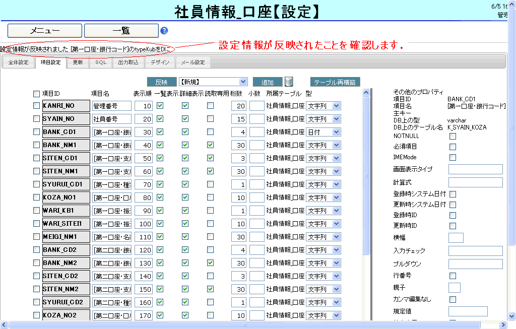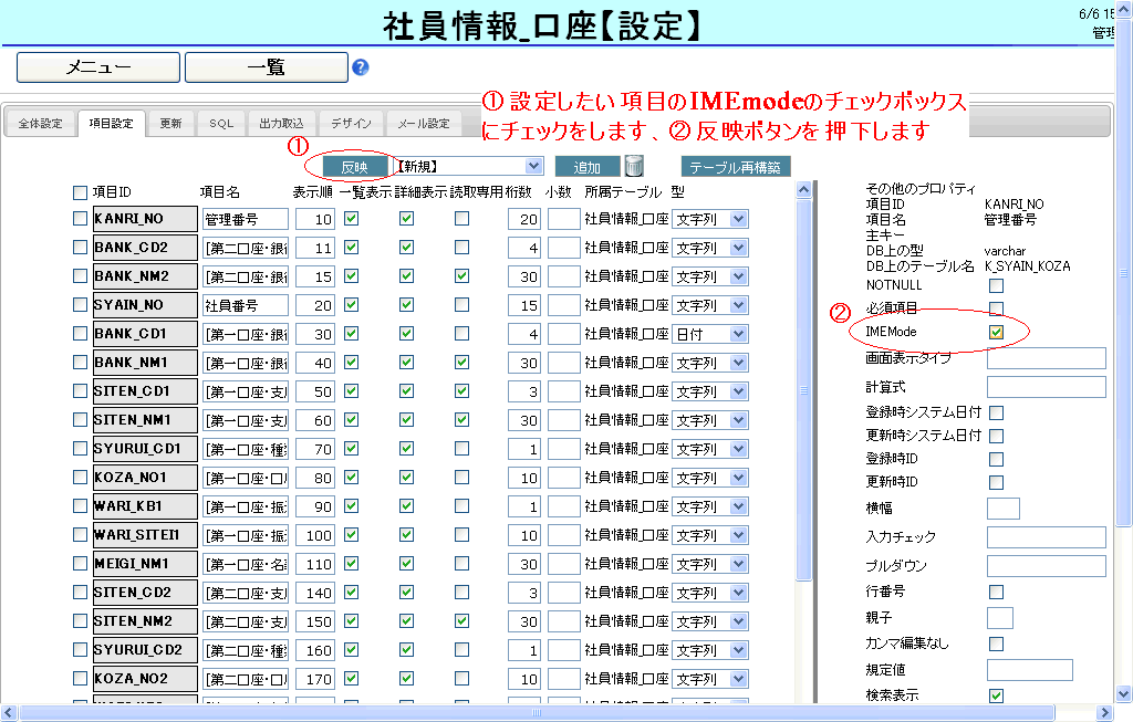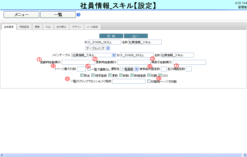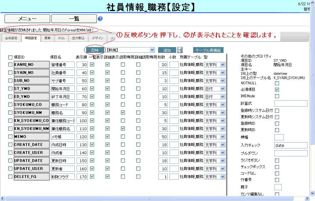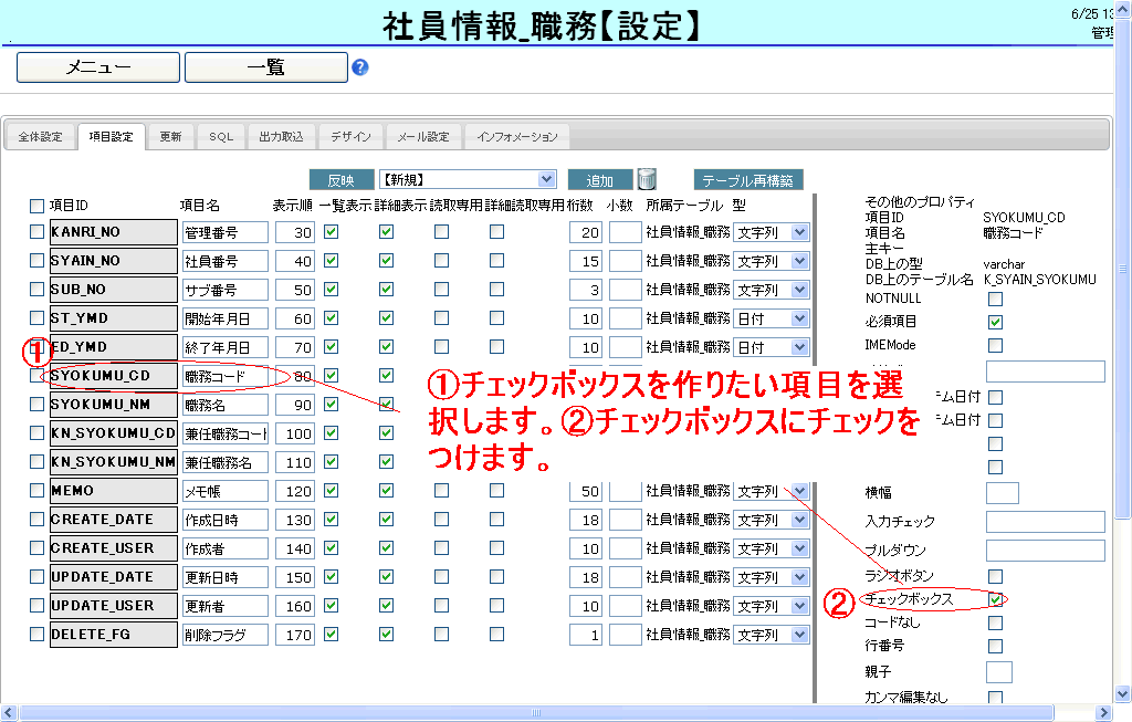 | ⑨更新時システム日付 | チェックをつけるとその項目を更新した日付が自動で反映されます |