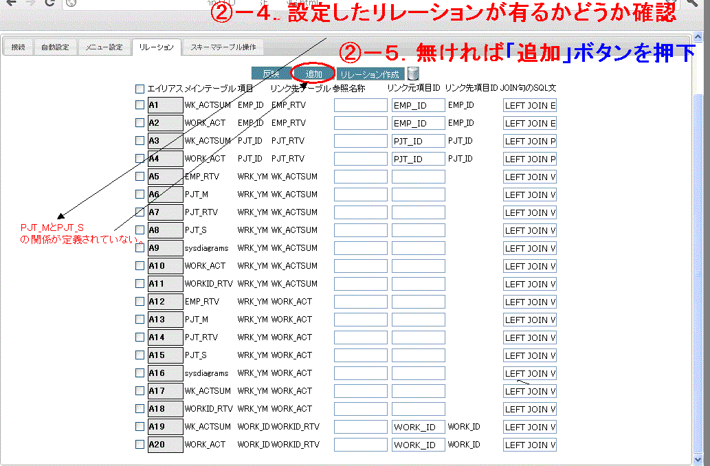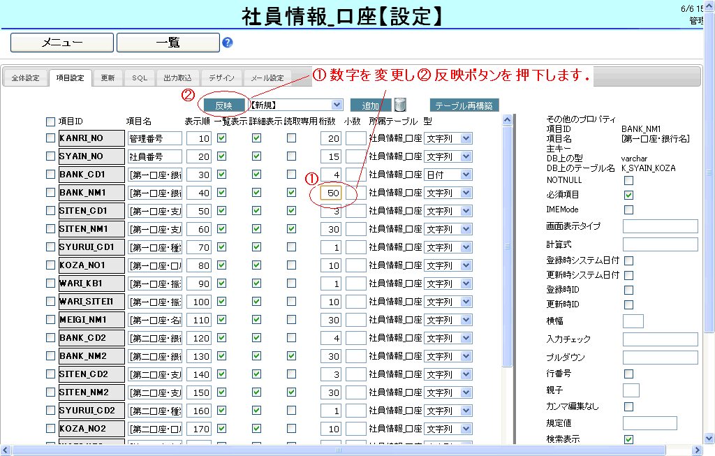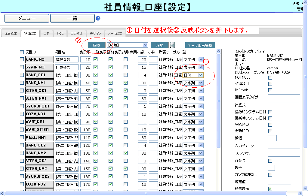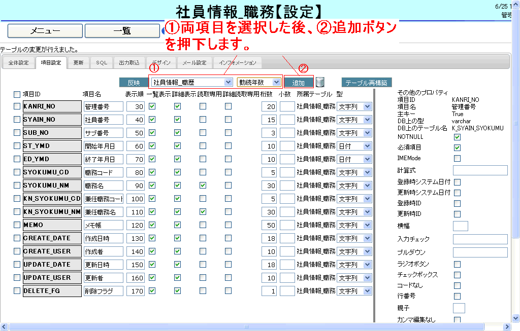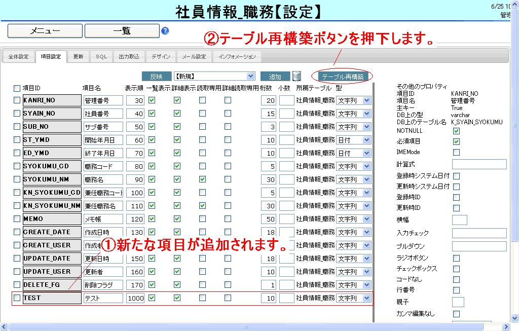 | ④テーブル再構築 | 新しく列を追加した後に押下します |