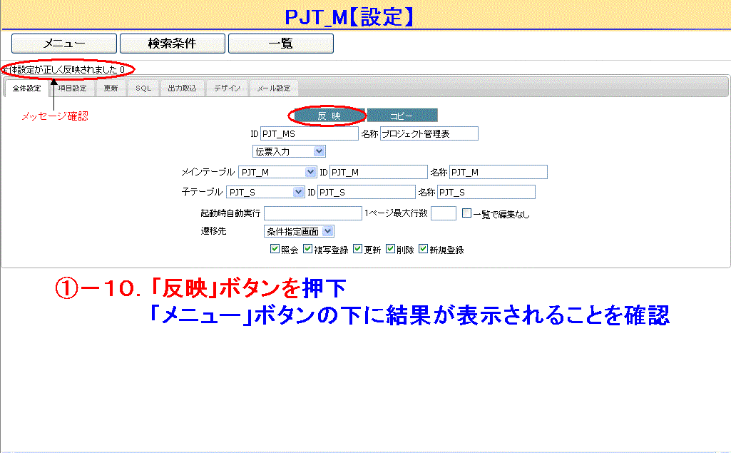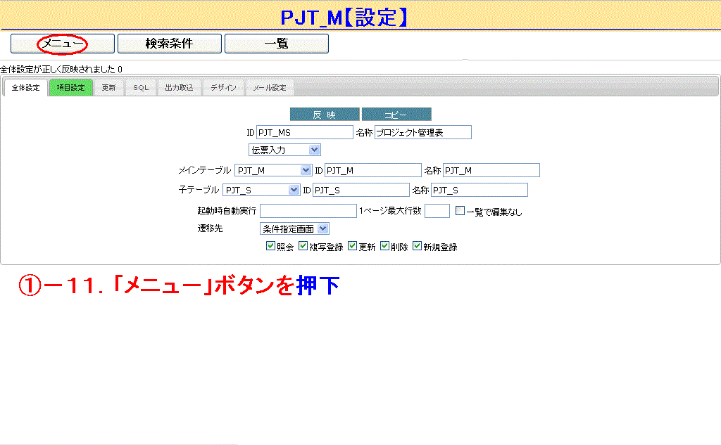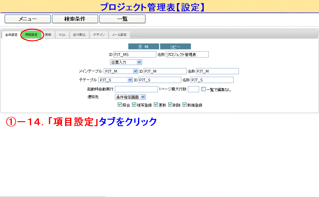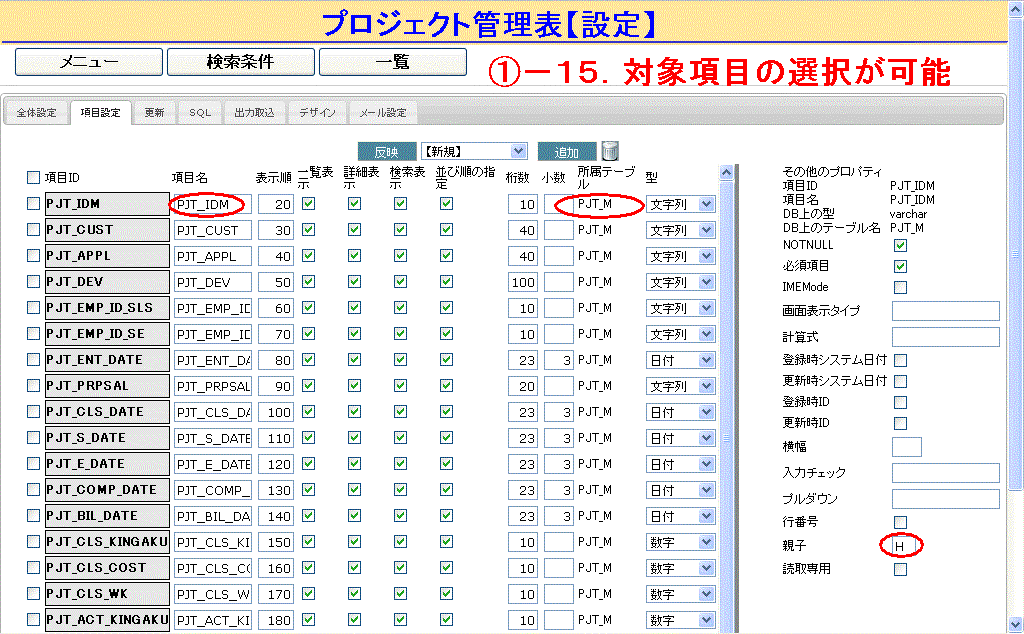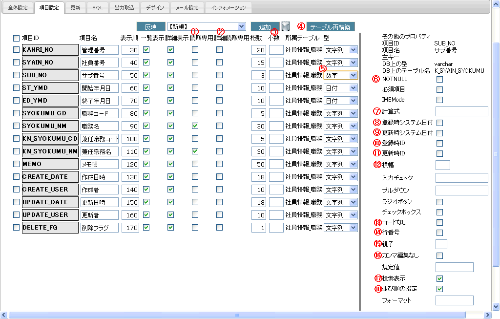 | ⑭行番号 | 親子テーブル作成時に、子供テーブルにチェックがつきます |