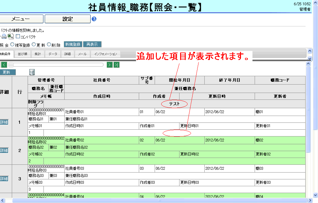 | ⑩登録時ID | チェックをつけると、その項目を登録した人のIDが表示されます |