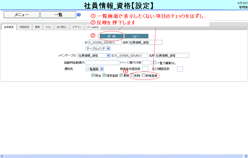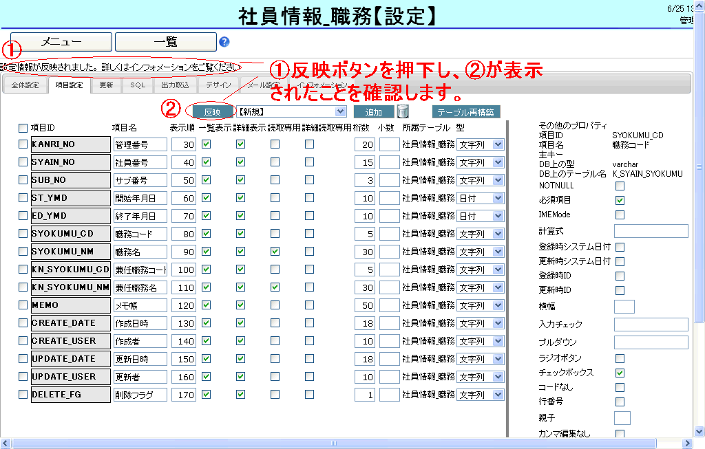 | ②詳細読取専用 | 詳細画面でチェックをつけた項目を読み取り専用にします |