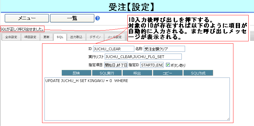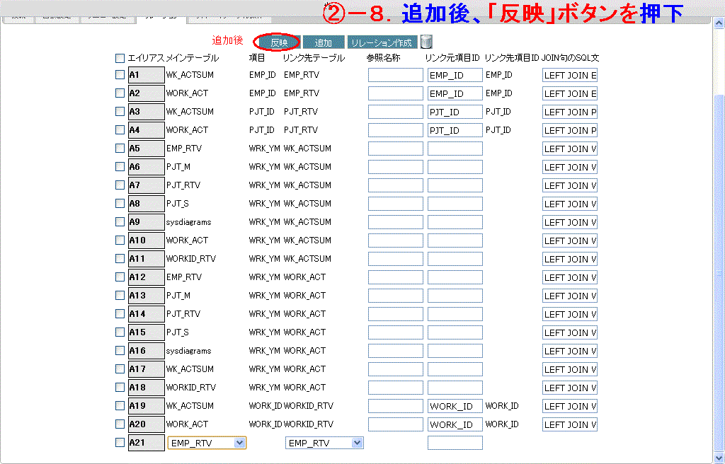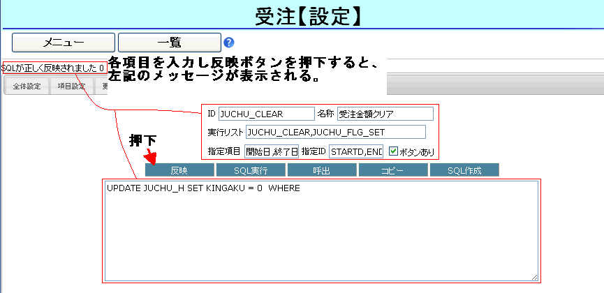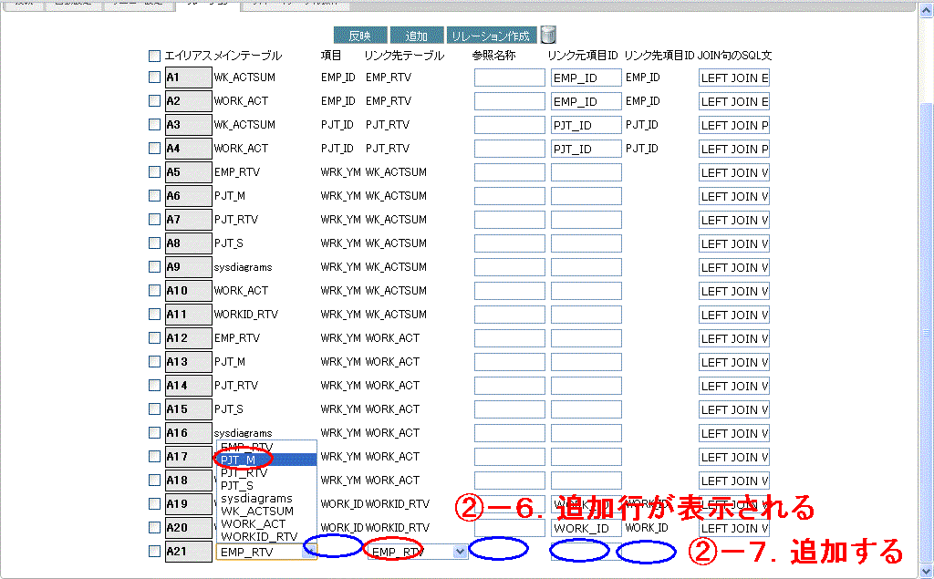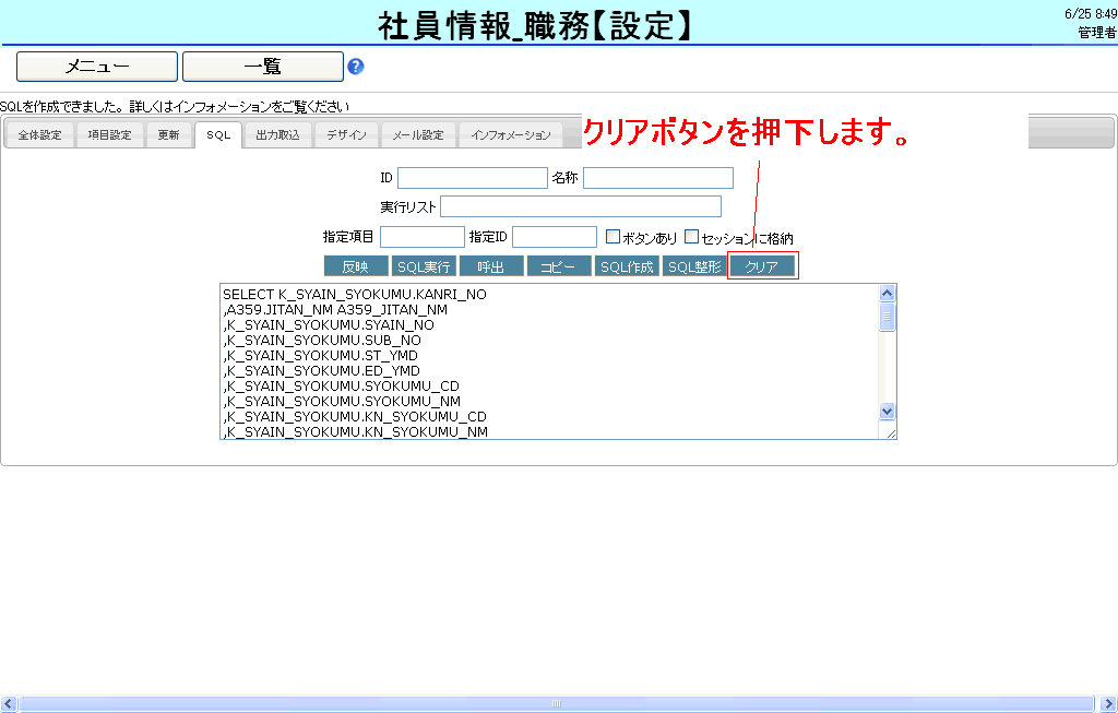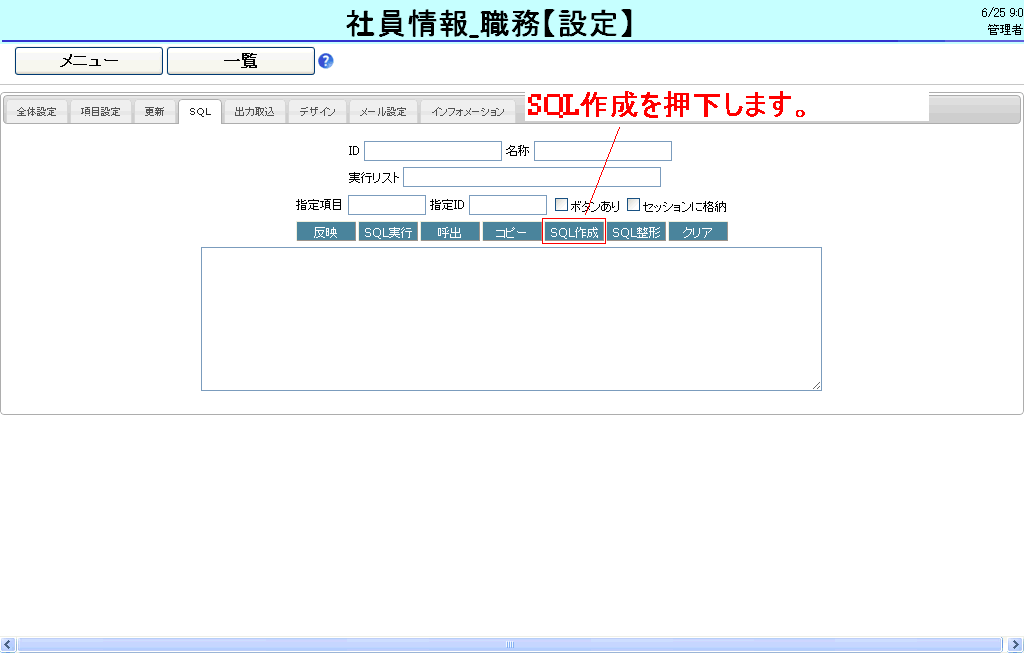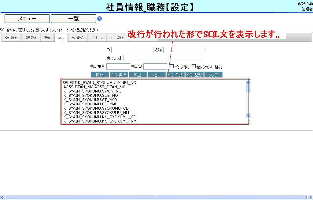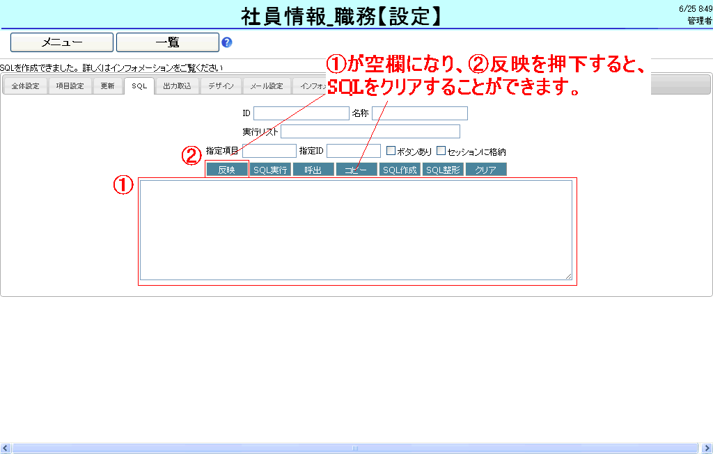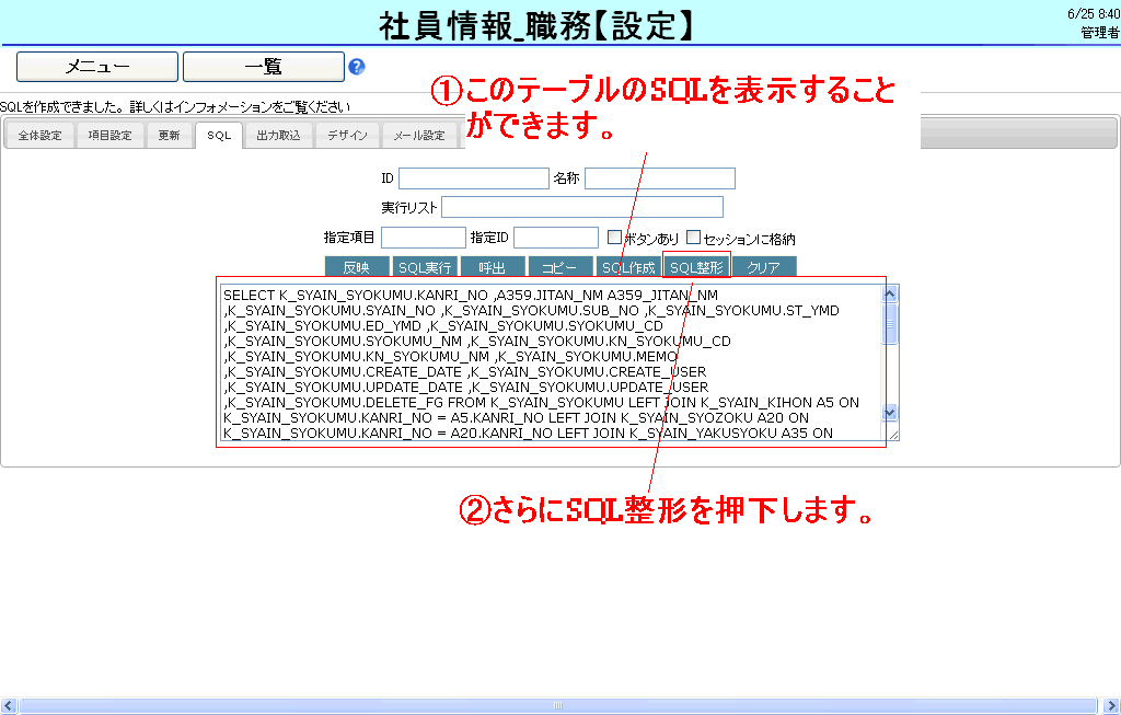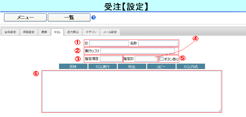 | ⑥SQL文表示画面 | SQL文を表示、編集するテキストエリア.ここにSQL文を入力し、 反映ボタンを押下するとSQL文の内容を反映させることができます。 |